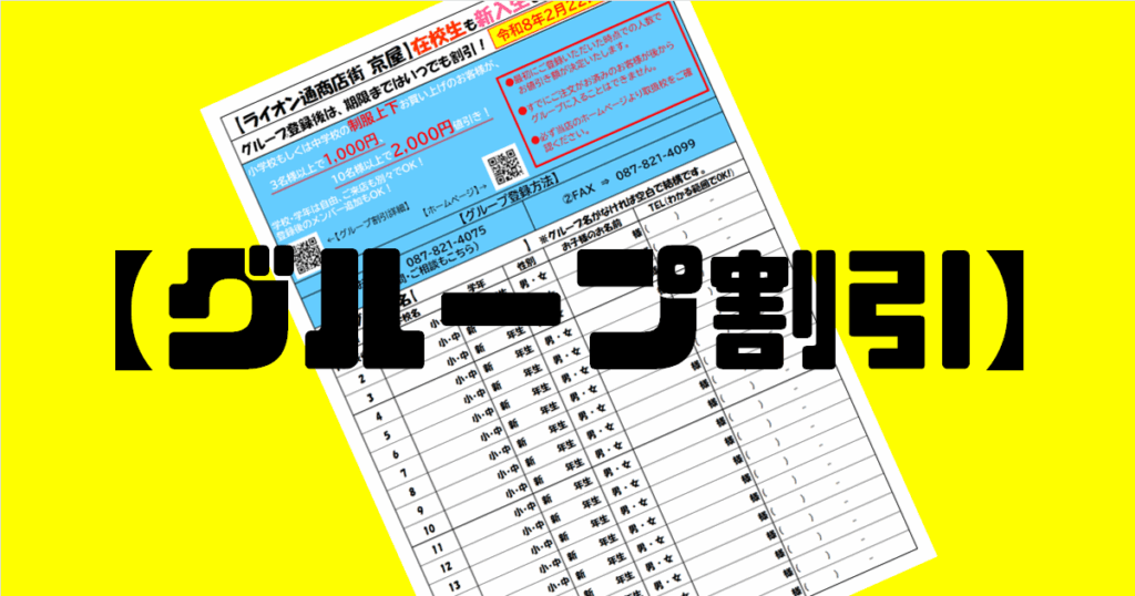 ※栗林小学校の方は、ご購入の合計が¥20,000円以上のお客様がグループ割引の対象となります。